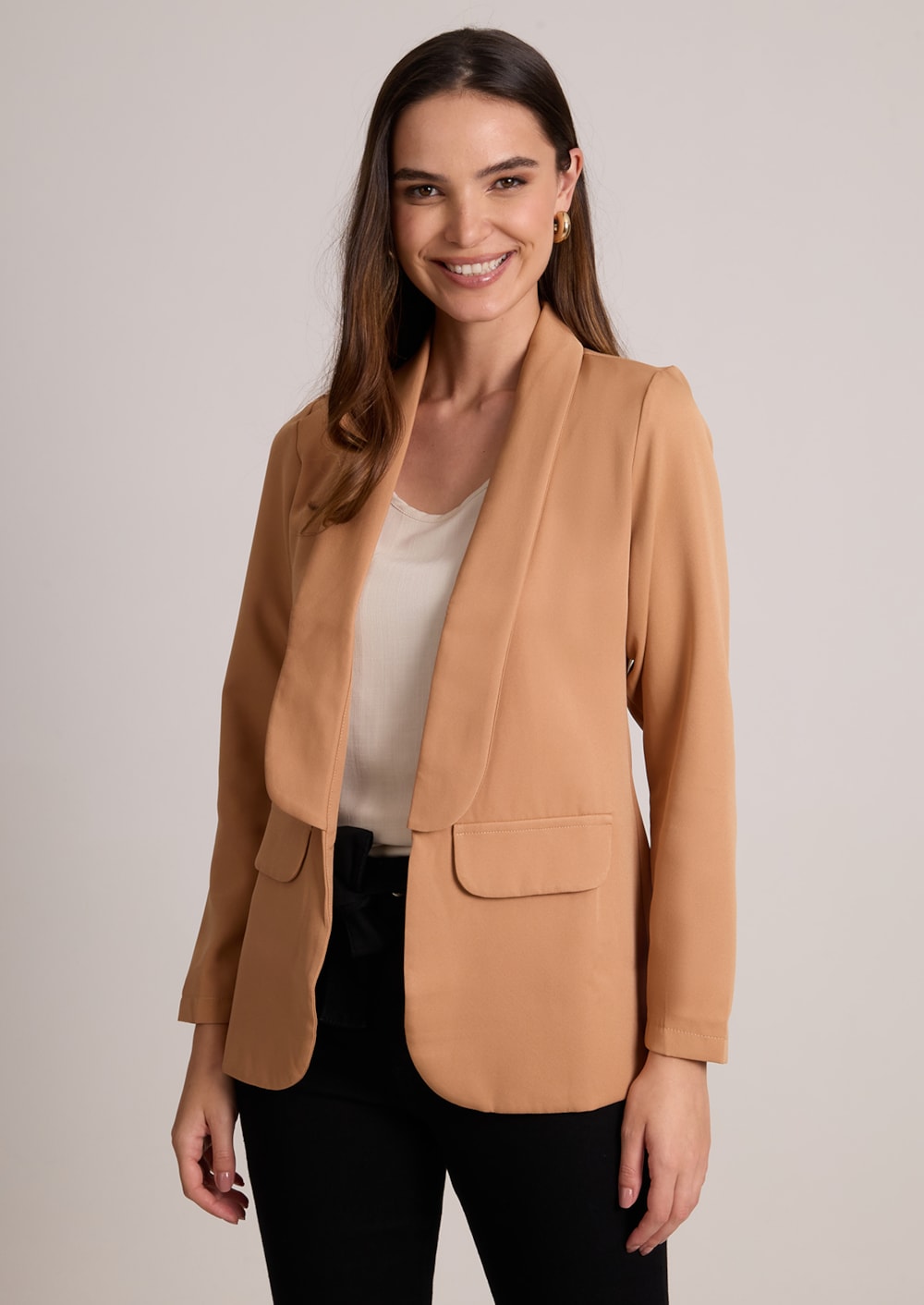 Blazer feminino em alfaiataria, a peça ideal para quem busca sofisticação com um toque moderno. Seu corte clássico valoriza a silhueta de forma elegante e discreta, garantindo um caimento impecável. O modelo sem fechamento traz praticidade, enquanto as lapelas finas adicionam um charme refinado. Os bolsos decorativos reforçam o design sofisticado, tornando-o uma escolha versátil para diversas ocasiões.