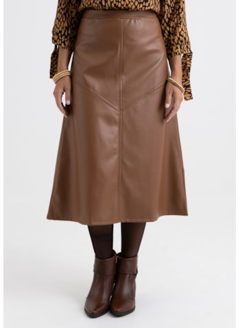 • Saia feminina midi em material sintético PU. Elaborada em material macio que remete ao couro, esta peça possui modelagem única, acabamentos e recortes especiais que trazem versatilidade e valorizam o visual. Ideal para quem busca uma saia atualizada para produções mais elaboradas.